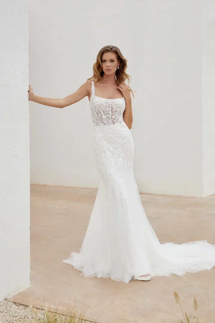 Inspired by the raw romance of an Italian countryside escape, Lillian West blends bohemian elegance with a free-spirited edge. Flowing fabrics, ethereal skirts, and soft draping evoke effortless beauty, while bold slits and statement sleeves add adventure. Matte lace, earthy tones, and delicate textures celebrate brides who love without limits.